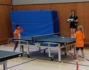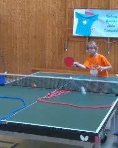 Meine Tochter Sina und ich sind morgens um zehn an der Halle angekommen. Der erste Augenblick war, dass die Halle ist wegen Überfüllung geschlossen wird. Es waren 41 Mädchen im Alter von 5-13 Jahren am Start, die als erstes ein knalliges oranges T-Shirt bekamen. Die Mädchen wurden in Gruppen eingeteilt und auf 5 Stationen aufgeteilt: 3 TT-Trainingsguppen in der Halle, 1 Bastel- und eine Koordinationsstation draußen.