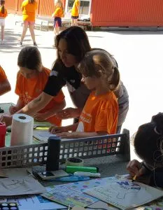 Nach ein paar Startschwierigkeiten und des verpassten Aufwärmens mit den Seil, ist Sina dann so langsam warm geworden, wohl auch, weil sie sie nach draußen zum basteln durfte. Es wurde ein Jute-Beutel selbst gestaltet. Danach ging es wieder nach drinnen und die Bälle, wurden je nach Leistungsniveau, durch die Halle geschmettert. Die Kinder haben zugehört, gelacht und nacheinander die unterschiedlichen Stationen durchlaufen. Der Spaß stand natürlich immer im Vordergrund! Gegen 13 Uhr gab es eine 1 Stündige Mittagspause und ein viele Pizzen wurden geliefert. In dieser Zeit konnten die Kinder sich auf dem Schulhof und in der Halle beim TT austoben oder ihre Bastelei vollenden. Nach der Pause ging es für Sina`s Gruppe nach draußen zum Koordinationstraining. Hier und da wurde auch gerne mit Wasser gespritzt.