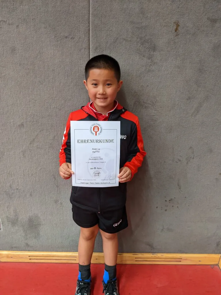 Am 24.+25.9.22 fanden die Norddeutschen Ranglisten der Altersklassen U13 und U11 in Hamburg statt. Durch den tollen 2. Platz beim Hamburger Ranglistenturnier wurde für Avon ein Verfügungsplatz beantragt und so durfte er sich mit den 8 besten Spielern aus dem Norden messen. Da Avon noch bis Freitag auf Klassenreise war, erfuhr er erst einen Tag vor der Veranstaltung von der Teilnahme. Am Samstag im ersten Spiel gegen Matteo von der TTG 207 hat Avon sehr gut gespielt, er hatte eine hauchdünne Chance, das Spiel noch knapper zu gestalten, aber es hat nicht ganz geklappt. Danach kamen die 3 stärksten Spieler des Feldes. Auch hier konnte Avon teilweise mithalten, es fehlte ihm leider etwas Selbstvertrauen, Konzentration und Spielfreude. Das war sehr schade, aber auch verständlich, bei so einer überregionalen Veranstaltung, wo doch lauter und mehr geklatscht wurde, die Gegner sehr konzentriert waren und um jeden Ball gekämpft wurde. Das musste Avon erstmal alles verarbeiten.