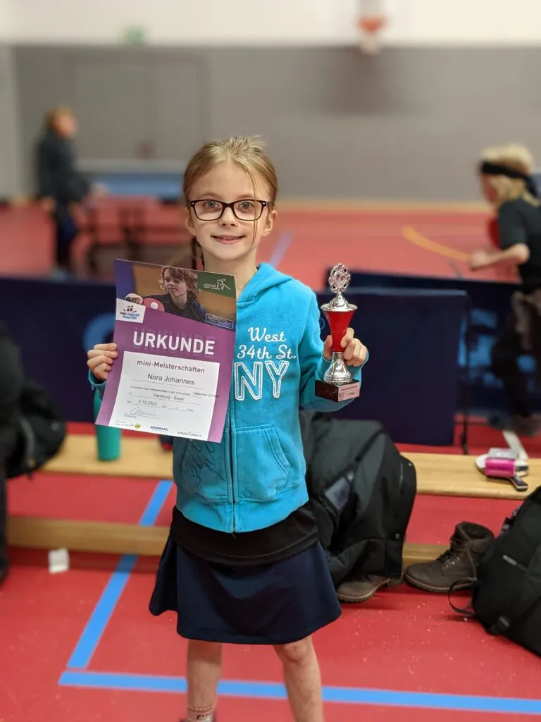 Es wurde zunächst in Gruppen gespielt, Nora spielte in einer Gruppe gegen alle Mädchen. Zunächst musste sie gegen die älteren Jahrgänge antreten, Jg. 2010-2013. Sie spielte jederzeit gut mit, es fehlte nur etwas die Durchschlagskraft und Reichweite. Aber in ihrer Altersklasse, 2014 und jünger gewann sie beide Spiele! Da alle Ergebnisse gewertet wurden, wurde sie 2. und hatte sich sehr über ihren Pokal gefreut! Nora, das hast du super gemacht!
