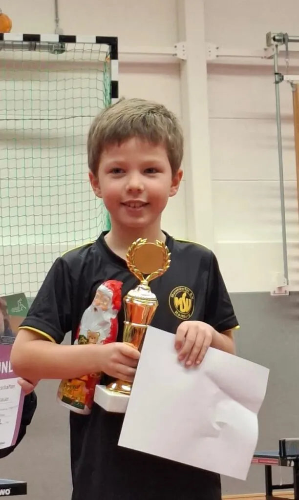 Dort gab es ein ganz klares 2:0 gegen einen anderen Gruppensieger. Im Halbfinale rächte er Jonas und gewann auch hier sehr souverän mit 2:0. Im Finale wartete der Spieler, der Ole gleich zu Beginn besiegt hatte. Aber diesmal drehte er den Spieß um, spielte unheimlich gutes Tischtennis,mit Blockbällen, Tospin und vor allem guter Übersicht und gewann tatsächlich mit 2:0 und wurde damit Saseler Minimeister!