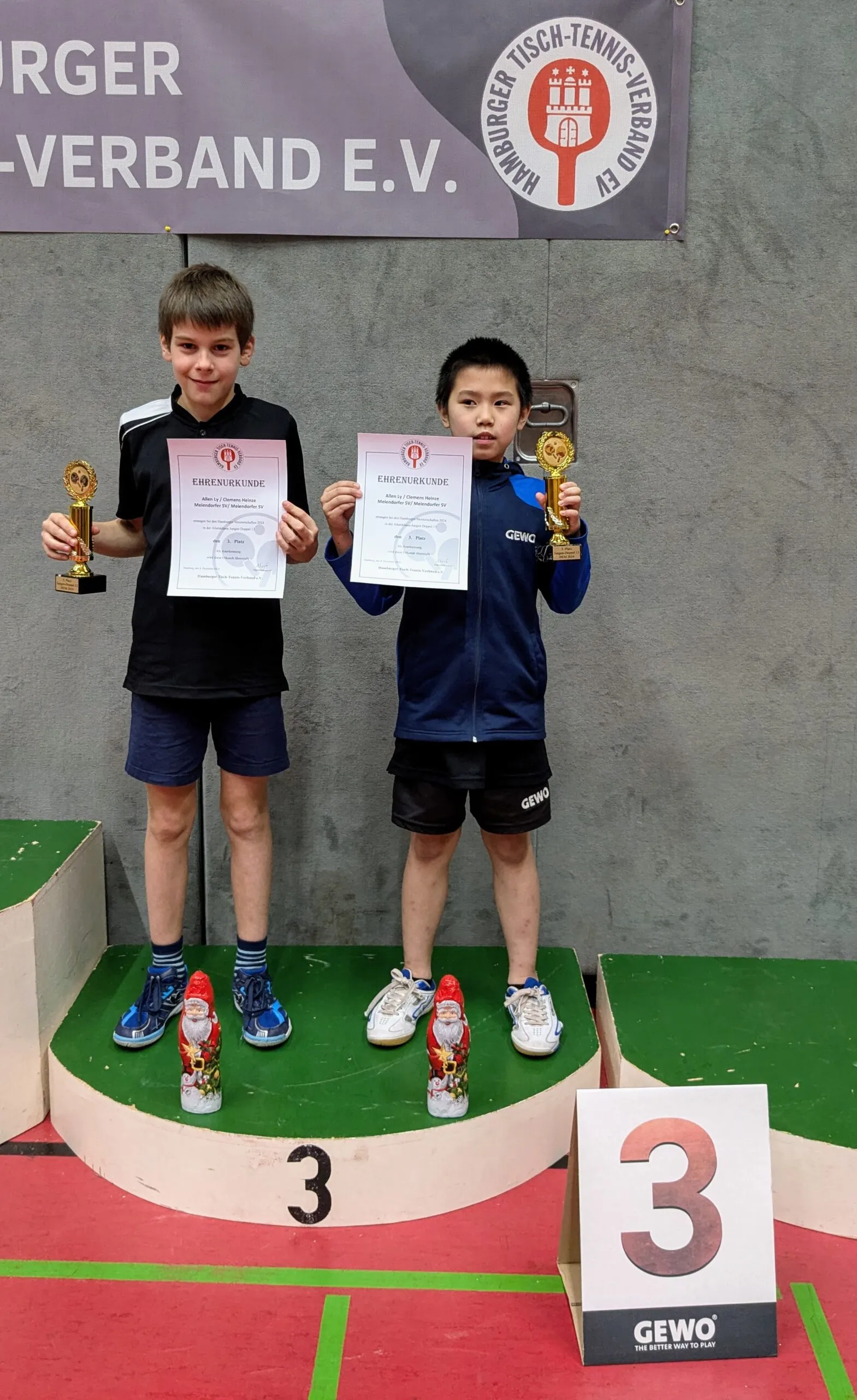Allen und Clemens mussten in der 1. Runde gegen die an 3 gesetzte Kombi aus Poppenbüttel und TTG207 ran, nach 0:2 Sätzen drehten sie das Spiel und gewannen im 5. Satz zu 10! In der 2. Runde spielten sie gegen eine Saseler Kombination. Sie lagen mit 0:1 und 2:1 hinten, aber ließen sich nicht beirren und gewann auch hier tatsächlich knapp im 5. Satz und waren damit im Halbfinale!