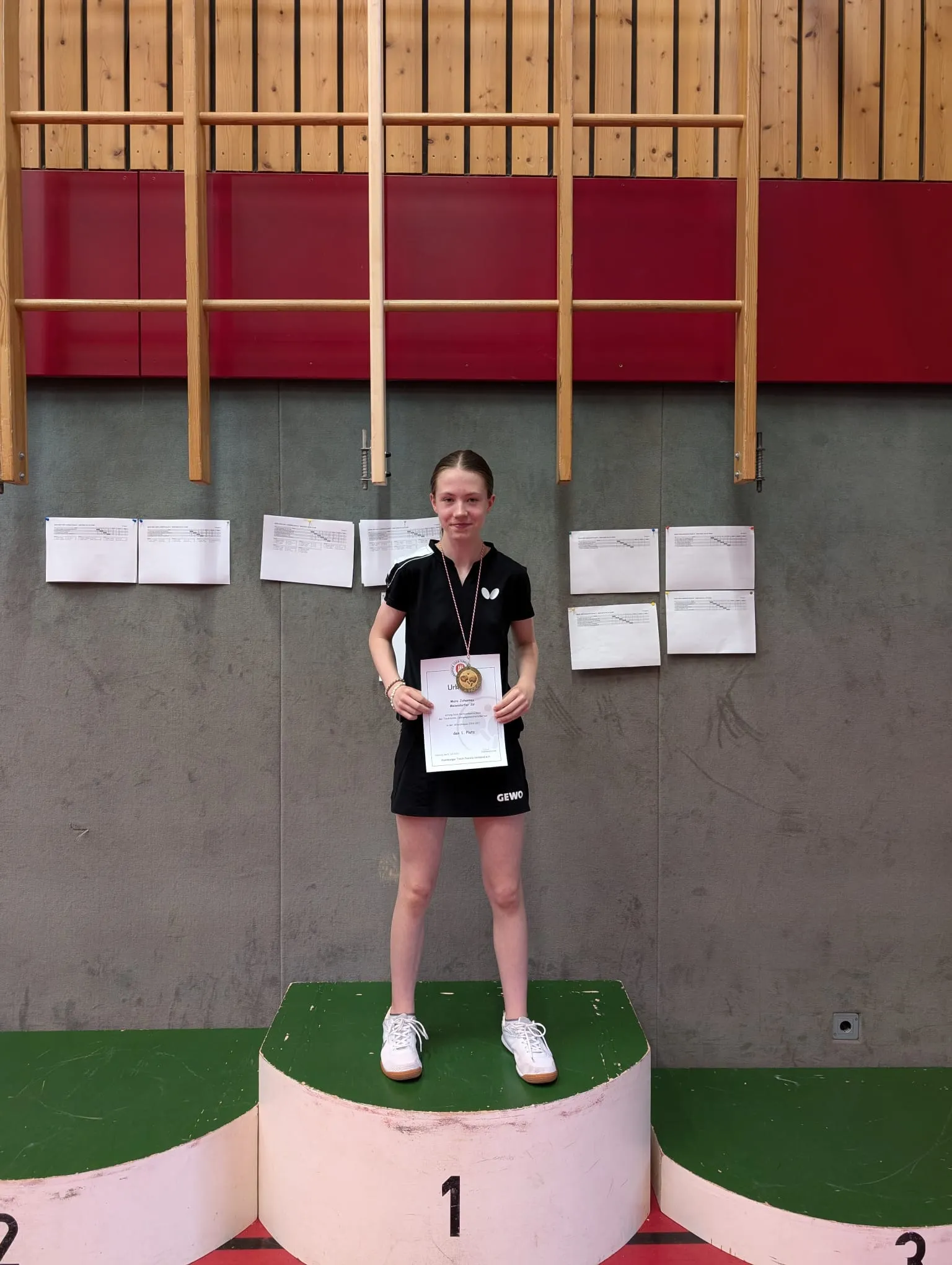 Die Jahrgänge 2010 und 2011 wurden bei den Mädchen zusammengefasst. Miriam Nemeth, die als Neuzugang von TuS Berne künftig in Meiendorfs Jugend aufschlagen wird, war in einer 6er Gruppe an Position 4 gesetzt. Sie musste als erstes gegen die an 2 gesetzte Spielerin ran und verlor das Spiel leider knapp erst im 5. Satz. Gegen die beiden anderen ebenfalls vor ihr gesetzten Spielerinnen hielt sie ebenfalls richtig gut mit und konnte die Sätze sehr knapp gestalten. Die an Position 5 und 6 gesetzten Spielerinnen konnte sie bezwingen und so ihre Setzung in der Gruppe bestätigen. Mara Johannes wurde ihrer Favoriten-Rolle gerecht und lieferte mal wieder ein überragendes Turnier. Sie gab in der Gruppe keinen Satz ab. Ex-Meiendorfer Darius war als Coach zu Beginn an ihrer Seite, später dann Jan, vielen Dank dafür. Das Halbfinale konnte sie mit 3:1 für sich entscheiden. Auch im Finale war sie siegreich und holte so das nächste Gold für Meiendorf als Jahrgangsmeisterin 2010 und 2011!
